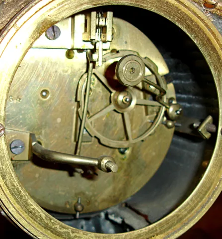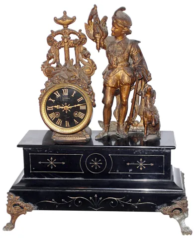 this clock is in nice overall condition, with intact marble base and old surface on the cast metal figures -- hunter, game, dog, musket, etc. -- and o...