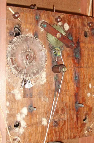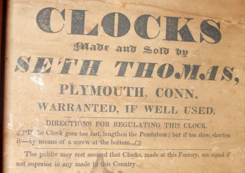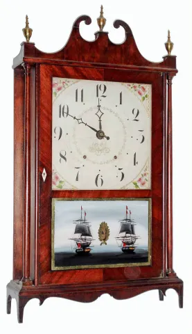 Seth Thomas Clock Co., Plymouth, Conn., 30 hour, time and strike, weight wood movement pillar and scroll shelf clock, c1825