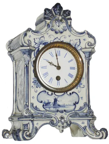 French Delft porcelain 8 days, time only, mantel clock, c1890