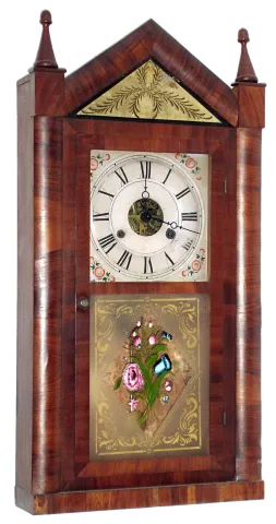 Seth Thomas Clock Co., Plymouth Hollow, Conn., 30 hour, time and strike, rosewood steeple top round molding front shelf clock. c1860