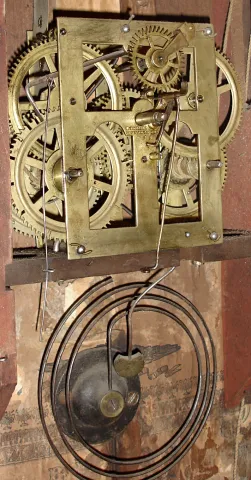 Refinished rosewood veneered case with veneer loss on the base, the bottom right side molding and a small repair on the steeple molding. Original pai...