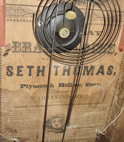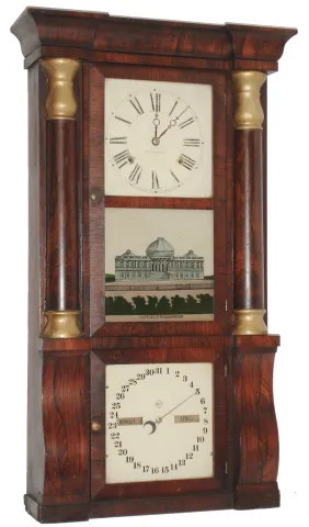 Seth Thomas Clock Co., Plymouth Hollow, Conn., "Gilt Cap Column Calendar", 8 day, time and time, weight rosewood veneered column and cornice calendar shelf clock, c1865