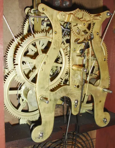 Refinished rosewood veneered case in nice condition with veneer loss on the base and a couple of chips on the top edge of the cornice. The time and c...