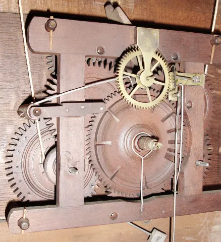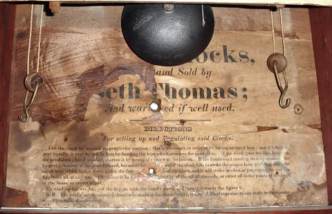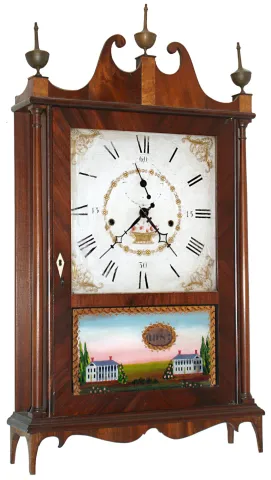 Seth Thomas Clock Co., Plymouth, Conn., 30 hour, time and strike, weight wood movement off-center pillar and scroll shelf clock. c1822
