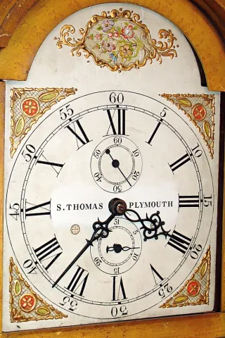 the old case retains a great original vinegar grain painted surface with some wear and flaking to the right side and hood door. The movement is in go...