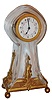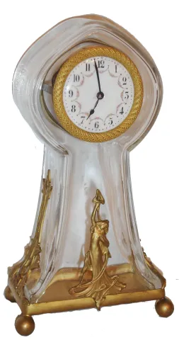 French, table clock, 8 days, spring driven movement in a glass case with applied gilt castings and gilt bezel and multicolor white enamel dial, c1910
