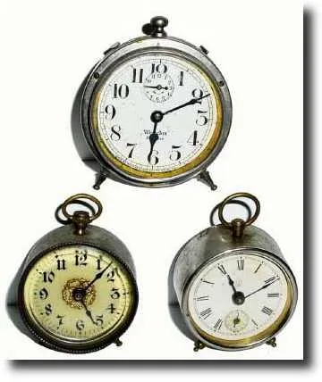 clockwise from the top: a Westclox Baby Ben, nickel case, less bail, a Waterbury "Beetle", in nickel, ticks and stops, and last, a mini Westclox timep...