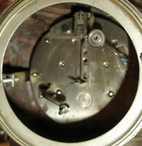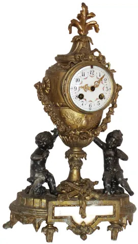 the intact ornate case has an old dull patina with wear and oxidation, and the alabaster panel in front is okay. The porcelain dial, with its multico...