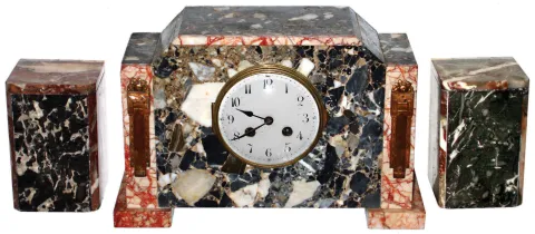 French marble Art Deco 8 day time and strike clock garniture set, c1925