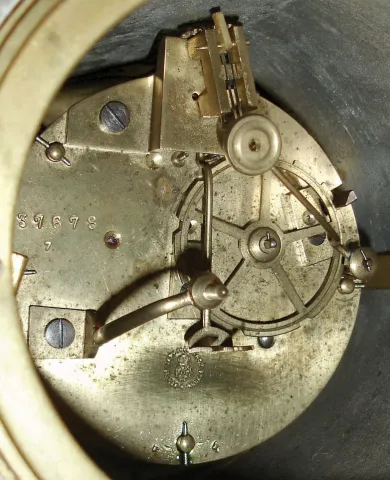 the bold and heavy marble case and side pieces are intact except for a few small corner and edge chips, and one of the cast brass side accents needs t...