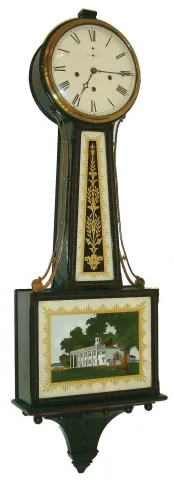 New Haven Clock Co., New Haven, Conn., 8 day, time, strike and Westminster chime patent or banjo clock. c1923
