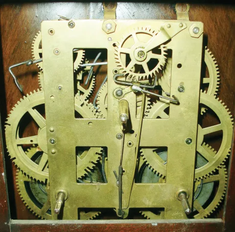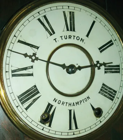New Haven Clock Co., New Haven, Conn., for T. Turton, Northampton (England) stained wood 8 day time and strike wall clock, c1890