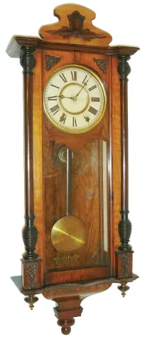 New Haven Clock Co., New Haven, Conn., Vienna regulator style wall clock, walnut case with glazed door and sides, door with turned half columns with ribbed capitals and bases, applied composition ornament, case top piece with applied carving, the base wit