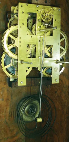 case with minor bumps, scrapes, and dings, dirty, composition ornament with minor losses and reglued to case, glasses appear to be original, central d...