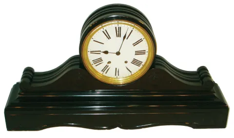 French very large black marble 30 day time and strike tambour mantel clock, c1890