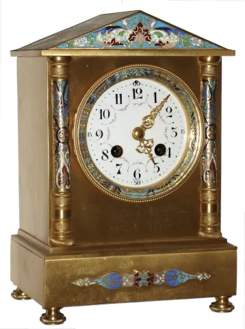 French cast brass and cloisonne 8 day time and strike mantel clock, c1890