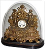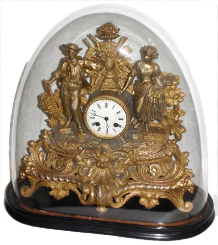 French gilt brass and spelter figural 8 day time and strike mantel clock on wood base with oval glass dome, c1880