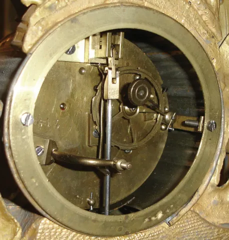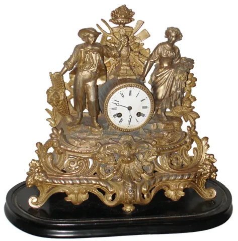 the gilding overall remains on much of this cast ornate case, with its agricultural theme, but there are areas of gray and copper showing through. Th...