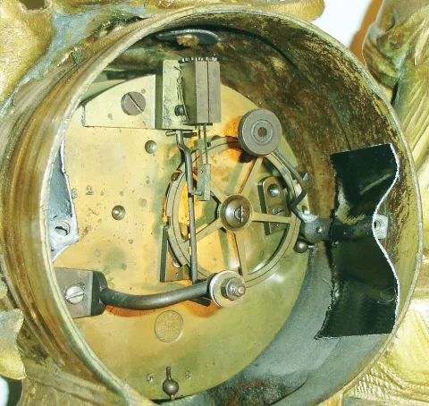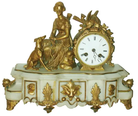 the clock, originally on a stand under a glass dome, has nice spelter figures of seated huntress, dog and bird,, with "Ph. Mourey" stamped on the back...