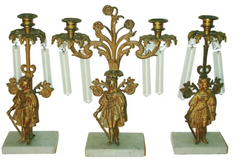 French figural alabaster 8 day time and strike mantel clock, selling with three cast metal candelabras with hanging cut glass pendants, c1880