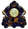 French mantel clock, cobalt blue glazed earthenware case with gilt ornament marked "England", Arabic numeral white enamel dial with sunk center, blued steel trefoil hands, gilt bezel with convex beveled glass, square plate 8 days, time and strike, movemen