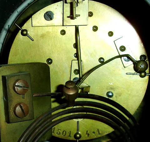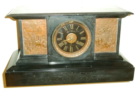 French, for Henry Semkem, Washington, black slate mantel clock, the front with incised line decoration, patinated bronze panels with Roman soldiers on horseback, some carrying severed heads on pikes, the left panel marked "Imperator" below their commander