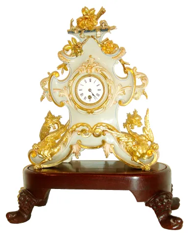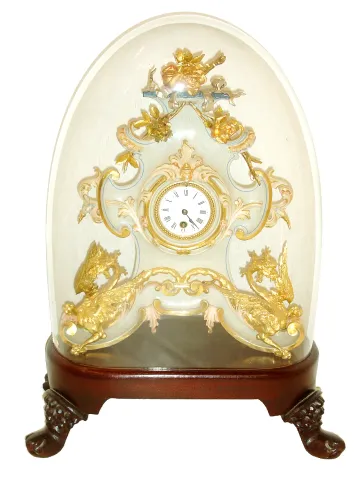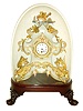 French mantel clock under dome, the case and ornament of carved wood and finished to look like porcelain, with floral and rococo style ornament, and the base with winged dragons, with bright and matte gilding, gilt beaded bezel, Roman numeral white enamel