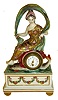 French mantel clock, porcelain case with figure of a woman seated on the clock and carried by a dolphin, her dress in gold and decorated with flowers, the dolphin with painted scales, base with polychrome floral swags, gilt trim and feet, Arabic numeral w