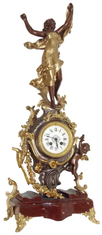 French figural mantel clock, red marble base with gilt scroll feet, the case with gilt and patinated rococo style ornament, trailing vines and flowers, at right a putto holding a bird, the top with female figure, her head back and with outstretched arms,