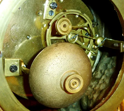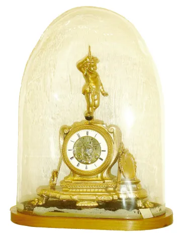 French mantel clock with conical pendulum, gilt spelter case with paw feet, top wit figure of a child with pendulum suspended from his right hand, Roman numeral white enamel dial with open center to allow viewing of the movement, 8 days, time and strike,