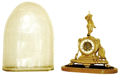case with repairs and now painted gold, dial with chips and hairlines, movement runs and strikes but will need service and adjustment, dome good, base...
