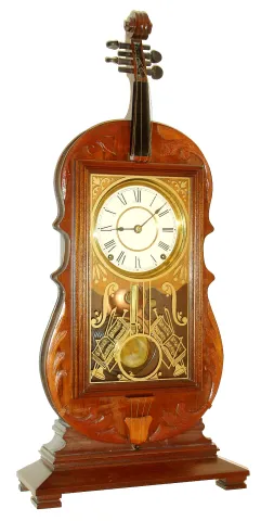 Reproduction Seth Thomas Violin mantel clock, 8 days, time and strike, spring driven Seth Thomas period lyre movement in a violin form walnut case with painted metal dial and musical themed silk screened glass, dated 1965