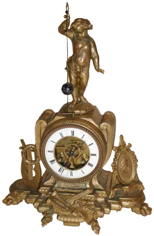 French conical pendulum cast metal 8 days, time and strike, mantel clock, musical motif, c1880