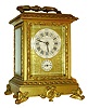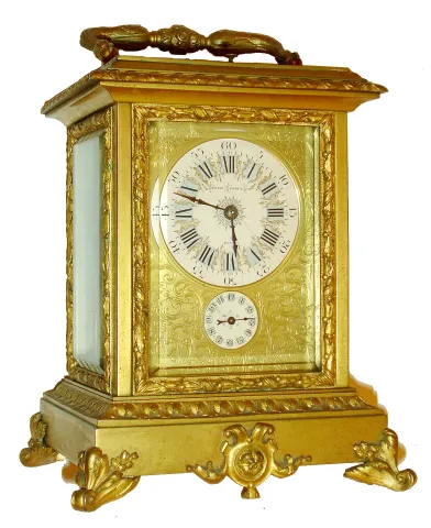 French repeating carriage clock with grand sonnerie striking, gilt case on scrolled feet with foliate ornament, ornate base molding, glass frames, and handle, case with beveled glasses, Roman numeral white enamel dial, the dark blue figures on pale blue g