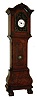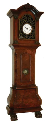 Miniature tall clock, burl walnut veneered case in the Dutch style, cast brass shield with scroll ornament and putti, Roman numeral white enamel dial, French 8 day timepiece movement with platform escapement, 19th century