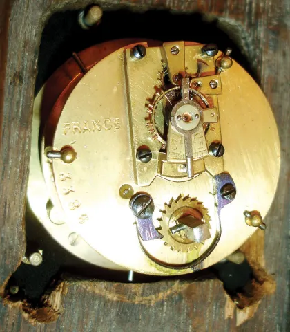 case with minor splits and joint separation, one piece of molding missing, left side, top molding with repaired split, dial with glued chip, and chips...