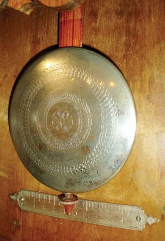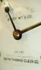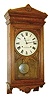 Seth Thomas Bundy time recorder wall clock, oak case with lower half missing, and the bottom attached to the shortened case, Roman numeral paper dial, steel spade hands, damascened nickel pendulum, 15 or 30 day timepiece movement, c1900
