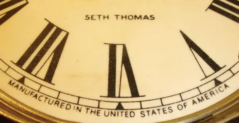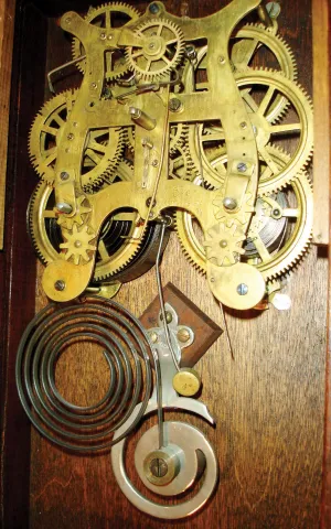 Reproduction Seth Thomas Violin Clock with 8 day spring driven lyre time and strike, movement in a nicely crafted late 20th century walnut case. The movement, damascened pendulum bob and cathedral gong are original 1880's Seth Thomas parts.