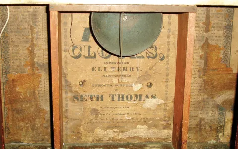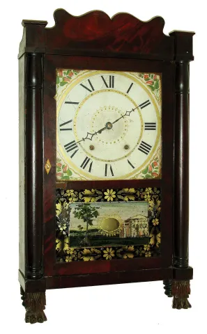 Seth Thomas Clock Co., Plymouth Hollow, Conn., 30-hour, time and strike, weight driven wood movement stenciled half column & splat shelf clock with carved paw feet, c1830