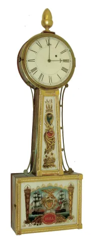 New England banjo clock, mahogany case with gilt frames, reverse painted tablets and gilt finial, Roman numeral white painted sheet iron dial, steel barbed hands, brass 8 day timepiece movement with arch cutouts at bottom of plates, movement mounted by a
