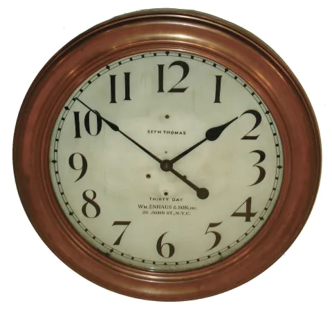 Seth Thomas Clock Co., for "Wm. Enhaus & Son, Inc., 26 John St., N.Y.C." 30 day time only, round copper-clad gallery clock with #86U twin-spring time only, movement, c1910