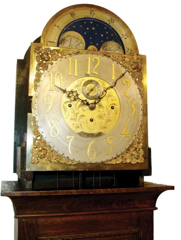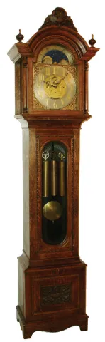 Seth Thomas Clock Co., Thomaston, Conn., tall clock, 8 days, time with quarter chimes on four bells and hour striking on cathedral gong, triple weight driven movement in a quarter sawn carved oak case with beveled trunk door glass and carved and turned fu