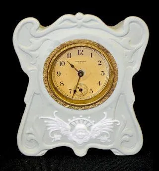 With a marked dial with seconds bit and a winged angel on the lower case. (The clock is wound tight.) 5" Tall...