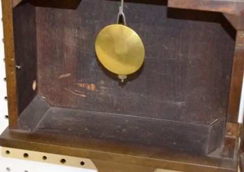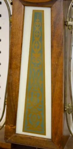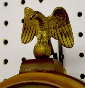 With a marked T & S metal dial and Deco numerals; eagle finial; the weight and the pendulum. 31" Tall Not tested....