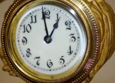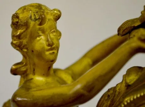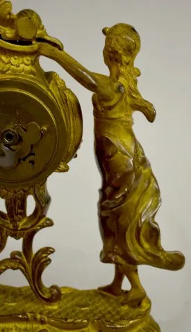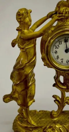 With a porcelain dial. (Wound tight. The gilt is worn.) 10" Tall...
