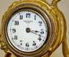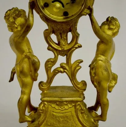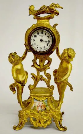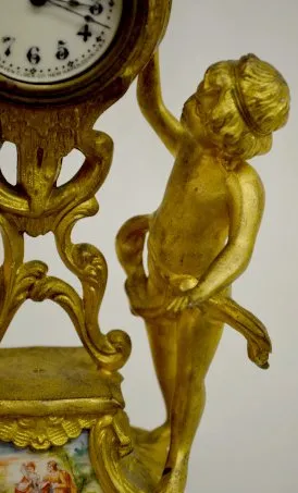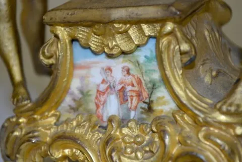 The clock has a porcelain panel with a courting couple. (There is some patina roughness and a damaged dial. The bezel is missing.) Not tested....