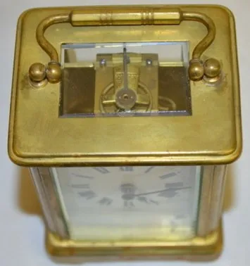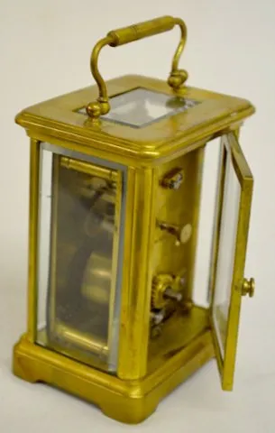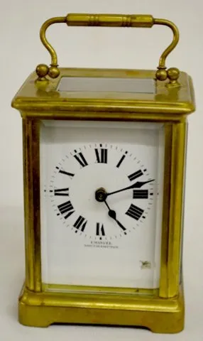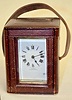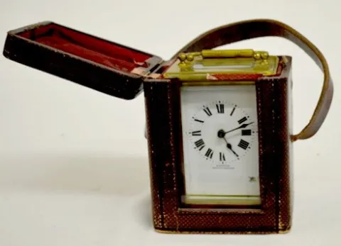 Marked "France"; in a brass frame with a porcelain dial and in an old traveling case. (The porcelain dial has some damage. The strap on the case is un...