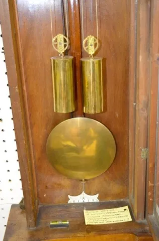 In a nice, carved case with brass trim, weights, pendulum; and a 2 piece porcelain dial. (There is minor case roughness.) 50" Tall; 17" Wide; 6 1/2" D...