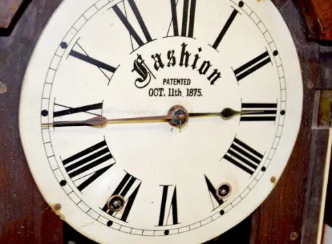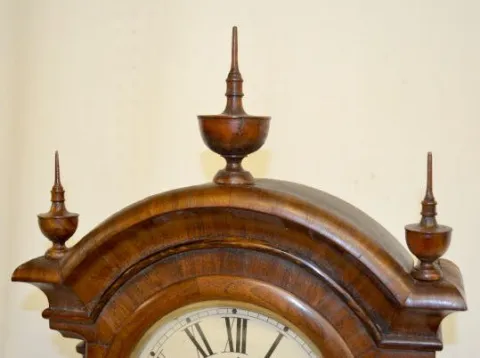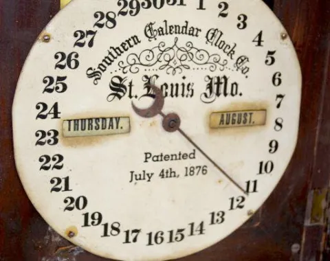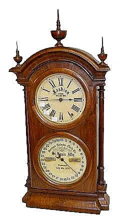 Seth Thomas /Southern Calendar Clock: Fashion Double Dial No. 2 with 8 day movement. 7" dials; 31 3/4" walnut veneer case (Minor roughness to veneer.)...