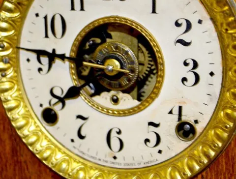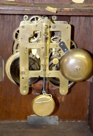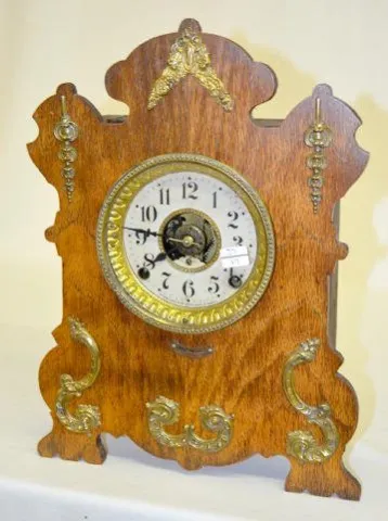 With metal ornaments; an 8 Day open escapement paper dial with alarm and the pendulum. 15? Tall x 11 1/2? Wide There may be minor, as expected, scuffs...